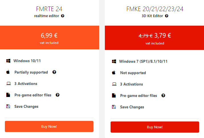 Choose your billing plan 1,25 € / month (billed biannually) All versions of FMRTE Access to the new FMKE 3 Activations per product Pre-game editor files Save Changes Subscribe 0,80 € / month (billed annually) All versions of FMRTE Access to the new FMK